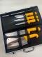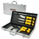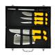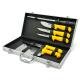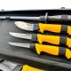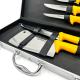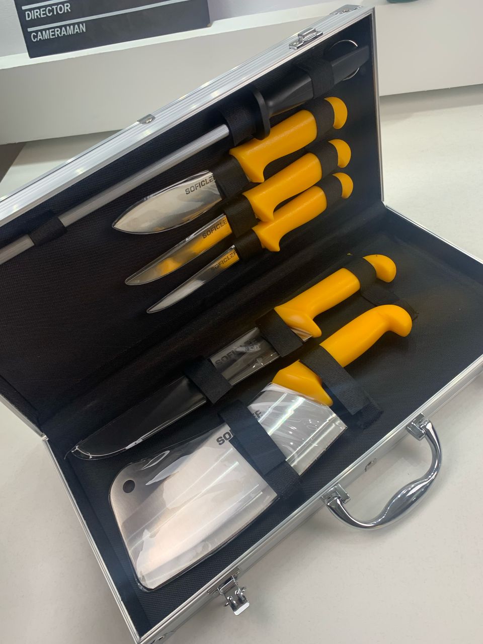 Découvrez ce coffret professionnel de cout-eaux de boucher Soficlef, conçu pour répondre aux exigences des amateurs et des professionnels de la découpe. Il comprend plusieurs cout-eaux à lame en acier inoxydable, un fusil à aiguiser, un couperet, un crochet à viande et une planche, le tout soigneusement rangé dans une mallette en aluminium robuste et élégante pour un transport et un rangement faciles. Les poignées ergonomiques jaunes offrent une prise en main confortable et sécurisée, même lors d’une utilisation prolongée.